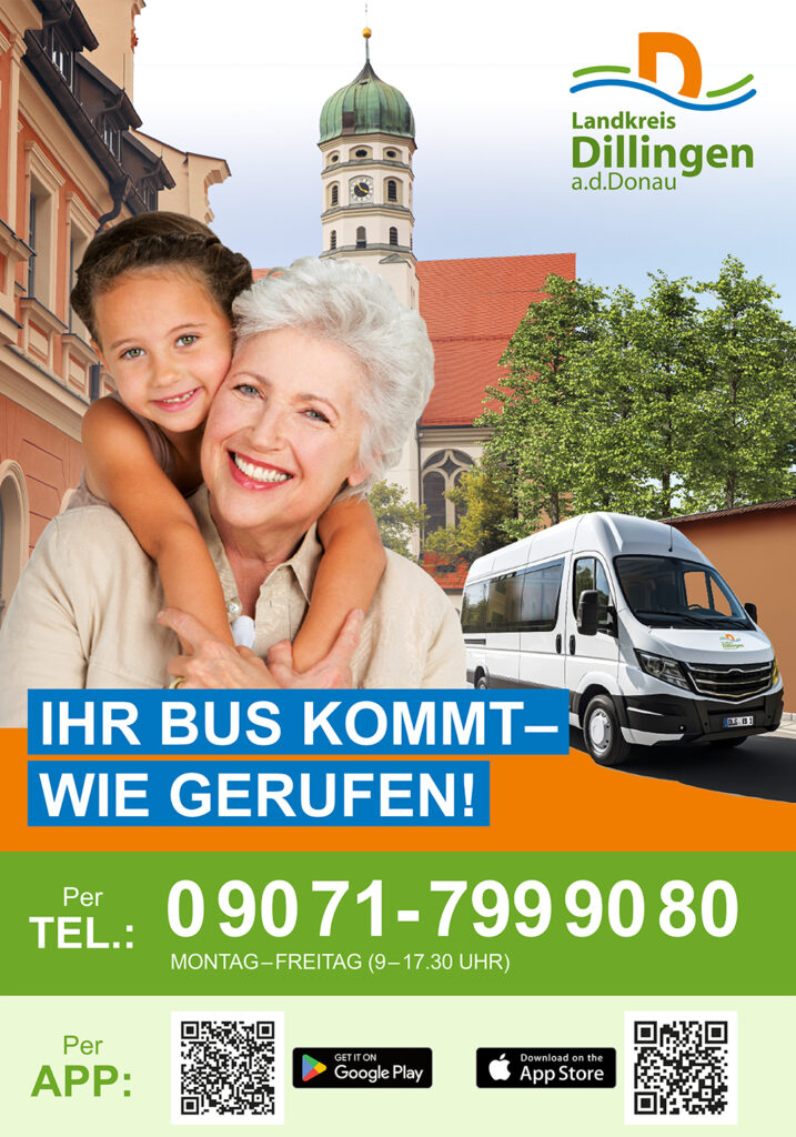 Sie reservieren Ihren Rufbus spätestens 60 Minuten vor Ihrer Fahrt. Ihr Rufbus kann rund um die Uhr online über die App des Landkreises Dillingen gebucht werden. Alternativ können Sie den Rufbus telefonisch reservieren. Sie gehen zur fahrplanmäßigenHaltestelle. Zur Abfahrtszeit schicken wir Ihren Rufbus dorthin Flyer 1 Es stehen Ihnen sieben Rufbus-Linien mit insgesamt 191 Fahrtangeboten zur Verfügung. Rufbus 96R Dillingen-Mörslingen-Unterfinningen […]